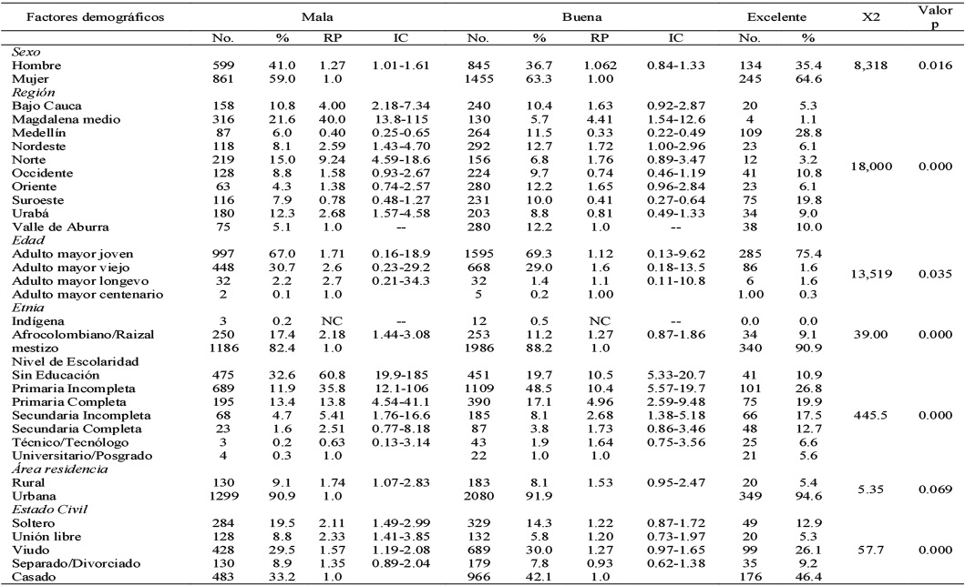 De igual forma, una proporción de adulto mayores de Medellín y Valle de Aburra, tienen una percepción desfavorable de la atención en salud, lo cual puede deberse a que en estos centros urbanos se presta la mayor parte de la atención de enfermedades crónicas de alta complejidad para el Departamento de Antioquia, saturando los servicios y disminuyendo la atención, que sumado a la crisis en el sistema de salud colombiano, favorecen la mala percepción (Agudelo et al., 2011: 2817–2828) tanto del estado de salud como de la calidad de vida de los adultos mayores.