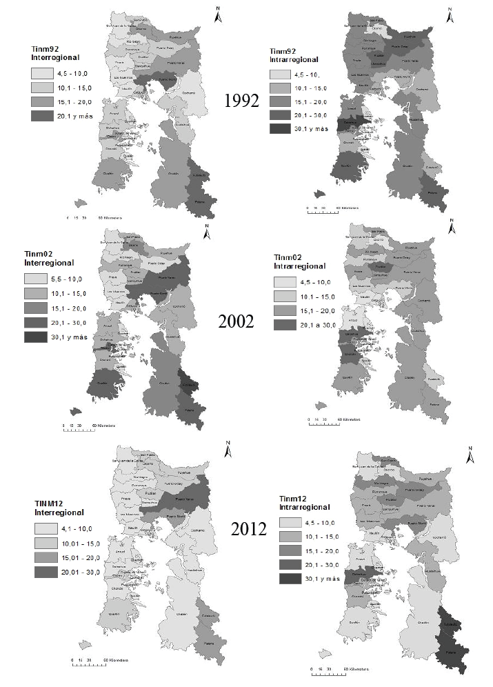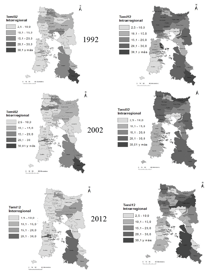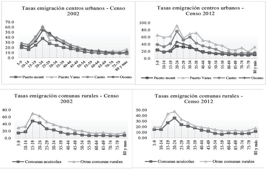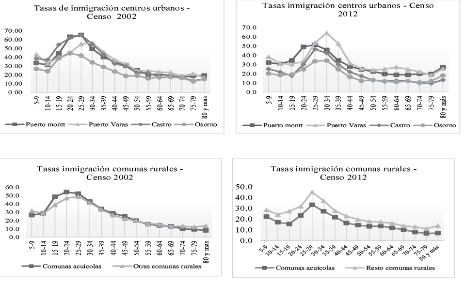 Las tasas de emigración en la región (Figura 2) fueron más altos en los periodos 1987–1992 y 1997–2002, son décadas marcadas por la migración campo-ciudad y el movimiento hacia comunas con mayores opciones de trabajo. Las comunas más emigratorias en ambos periodos son las que tienen una economía fundamentalmente agraria, al Noroeste y al Sureste de la región. Para el periodo 2007–2012, sin embargo, se observa un descenso de las tasas de emigración en las comunas de la región, principalmente en las comunas rurales del borde costero de producción agropecuaria. Una de las razones de este descenso es la inversión pública en infraestructura y fomento productivo que se ha realizado en los últimos 20 años en las zonas rurales, mejorando la conectividad y las posibilidades de desarrollo. Junto con ello, la “desaparición” durante los años 2008–2010 de la producción de salmón dejó en condiciones de alta vulnerabilidad y pobreza a las comunas que habían basado su crecimiento en este sector. Así, la crisis económica disminuyó el movimiento de población en el interior de la región, principalmente las migraciones entre comunas pequeñas con mayor desarrollo económico vinculado a la producción acuícola, como son las comunas Quellón, Dalcahue, Cochamó, Hualaihue, entre otras.