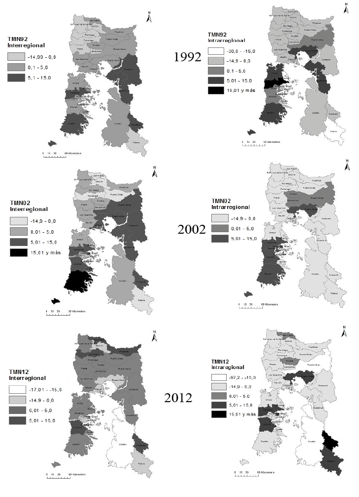 De las capitales provinciales, solamente Puerto Montt, como capital regional y provincial mantiene una TMN intrarregional positiva y, en cambio, las comunas de Osorno y Castro son expulsoras de población, lo cual se podría interpretar como que se ha ido acentuando el centralismo político – administrativo y económico de la región.