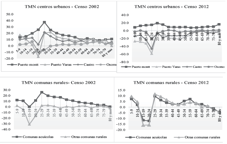 Las comunas de desarrollo acuícola, que antes de la crisis de 2007-2010 recibía población mayoritariamente entre 25 y 39 años y mantenían sus TMN positivas para todas las edades, han visto modificar sus flujos según los datos del censo 2012 y estas comunas comienzan a perder población a partir de los 15 años y hasta los 24 años. No obstante, pese a la crisis, las comunas acuícolas tienen menores tasas de emigración que las comunas rurales de base agropecuaria.