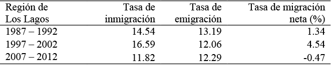 El censo del año 2012 muestra que en los últimos cinco años la región volvió a tener un saldo migratorio negativo, con una tasa de migración neta de -0.47 por ciento. Sin duda, la crisis de la industria salmonera y la pérdida de las fuentes de trabajo impactó en los flujos de población en la región (ver Tabla 1).