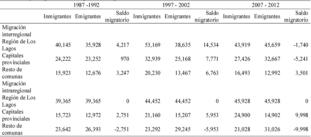 El 39.9 por ciento del flujo de inmigrantes internos en el periodo 1987-92 se concentraba en las comunas capitales de provincia, donde también vivía la mitad de la población de la región. Sin embargo, la progresiva atracción de las áreas urbanes hizo que, en los periodos 1997–2002 y 2007–2012, esta proporción aumentara hasta llegar a 54.21 por ciento. La mitad de esta cifra se asienta en la comuna de Puerto Montt, capital regional (ver Tabla 2).