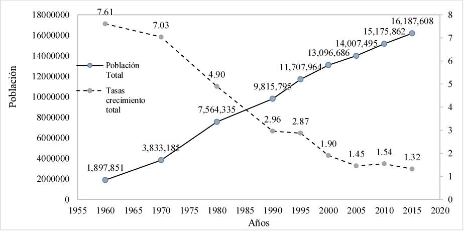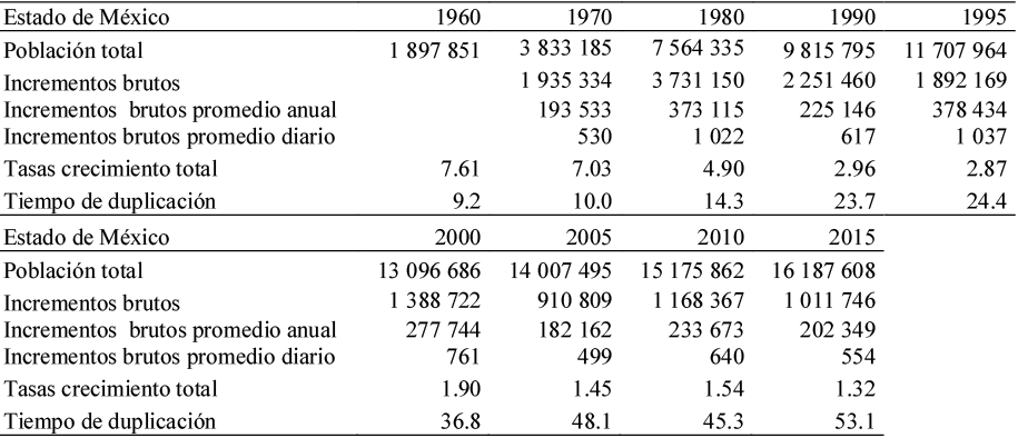 En 1960, de acuerdo al Censo de Población y Vivienda había 1.9 millones de habitantes. En 1990 este número alcanzó los 9.8 millones y para el 2015 fue de 16.2 millones. Esto es, 14.4 millones de diferencia en sólo 55 años. Por esto es fácil conocer muchas personas que han vivido —posiblemente sería mejor decir sufrido— el cambio y la masificación del Estado de México (véase Tabla 2).