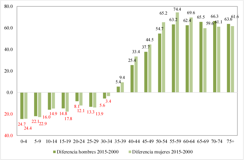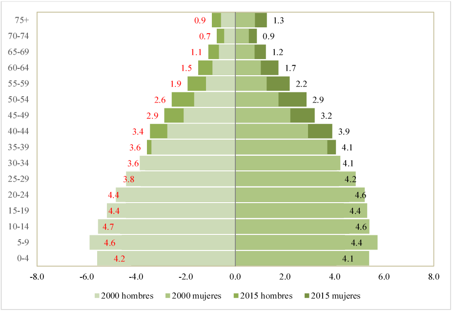En el caso de la comparación en números porcentuales de la pirámide por grupos quinquenales del Estado de México, entre 2010 y 2015, se muestra una tendencia muy clara de reducciones en los grupos menores al grupo de 35-39 años, mientras desde del grupo 40-44 años hay incrementos (véase Figura 3). Estos cambios se interpretan como cambios migratorios, o descensos de la fecundidad y no tanto como inercia demográfica debido a la velocidad con la que ocurren.