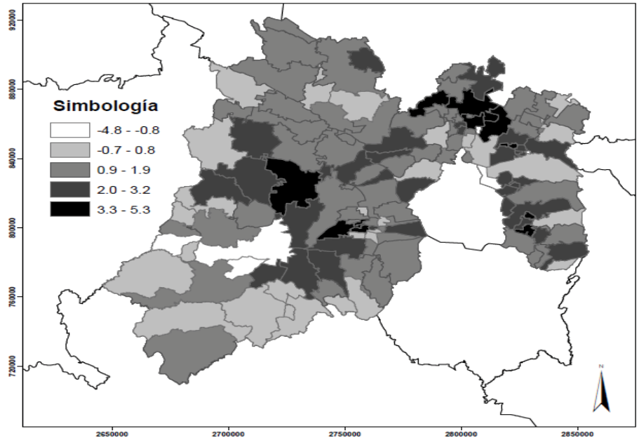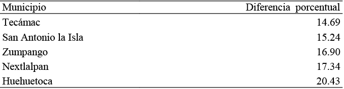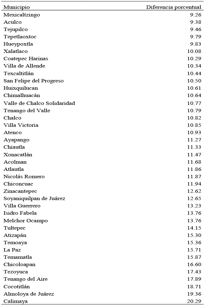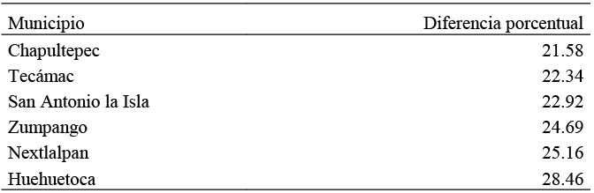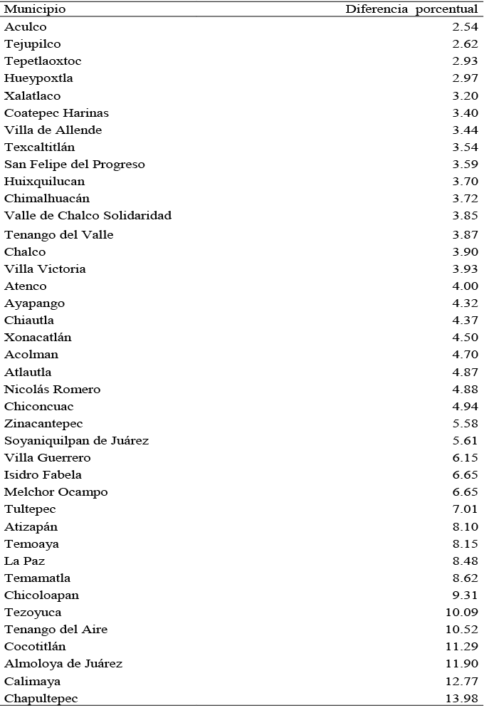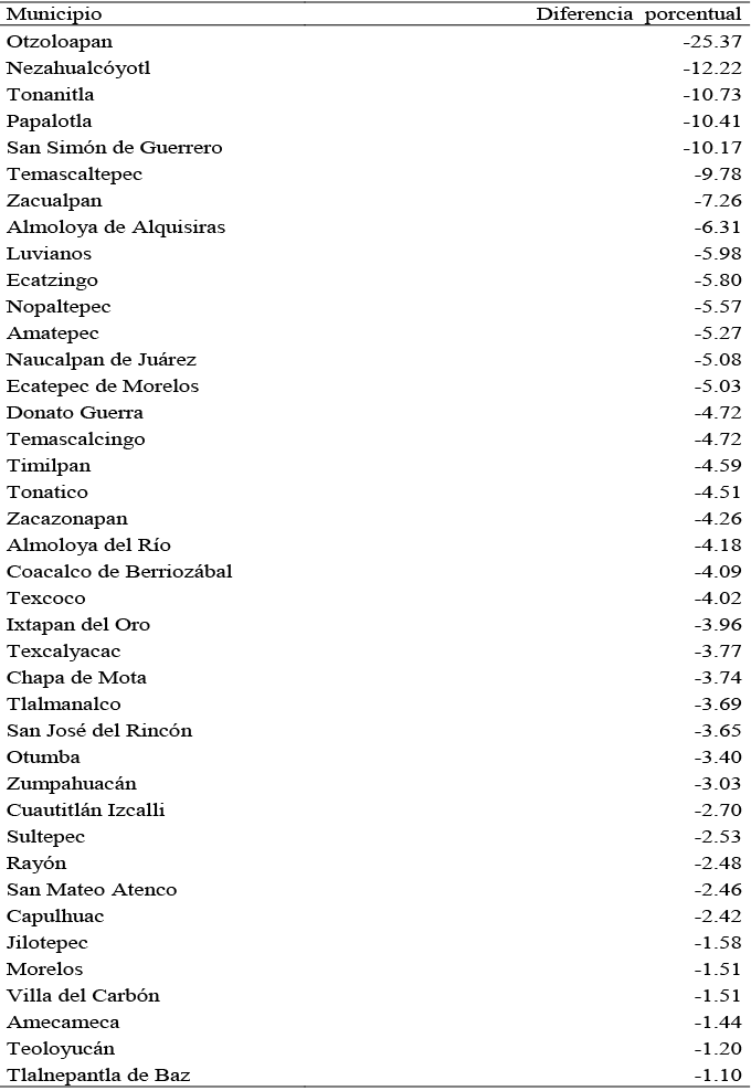 Destaca en la Tabla 5 el municipio de Nezahualcóyolt que muestra valores decrecientes en la población. El resto de los municipios que presentan disminuciones en valores absolutos corresponden a municipios rurales.