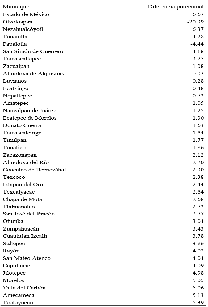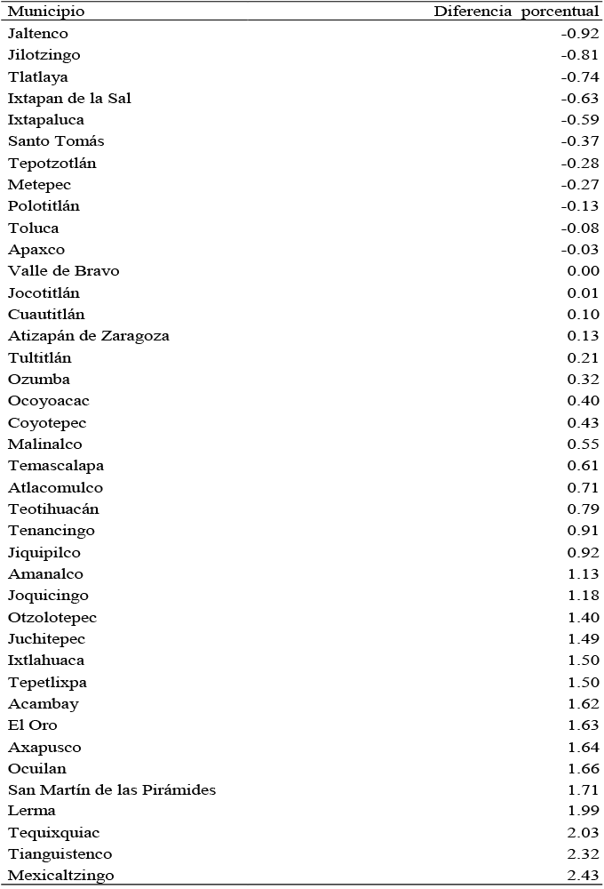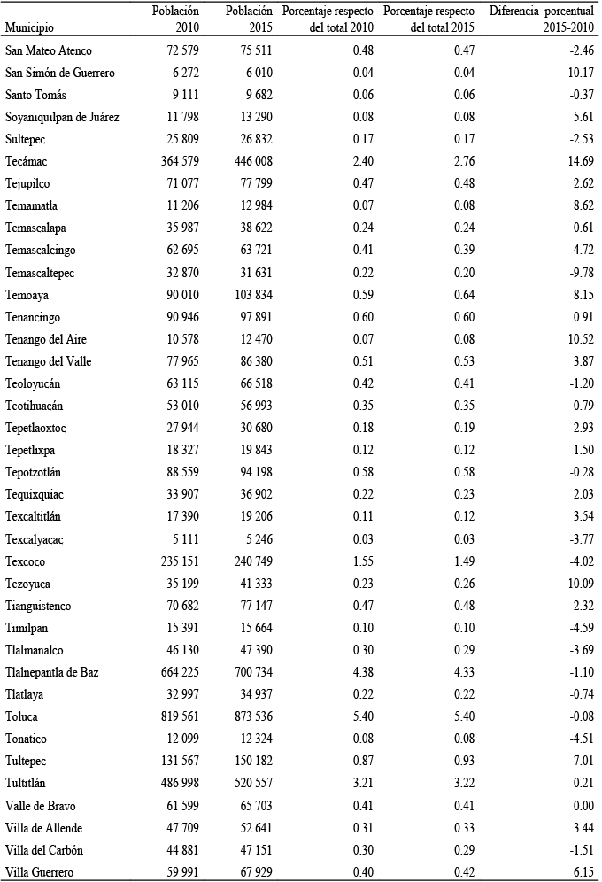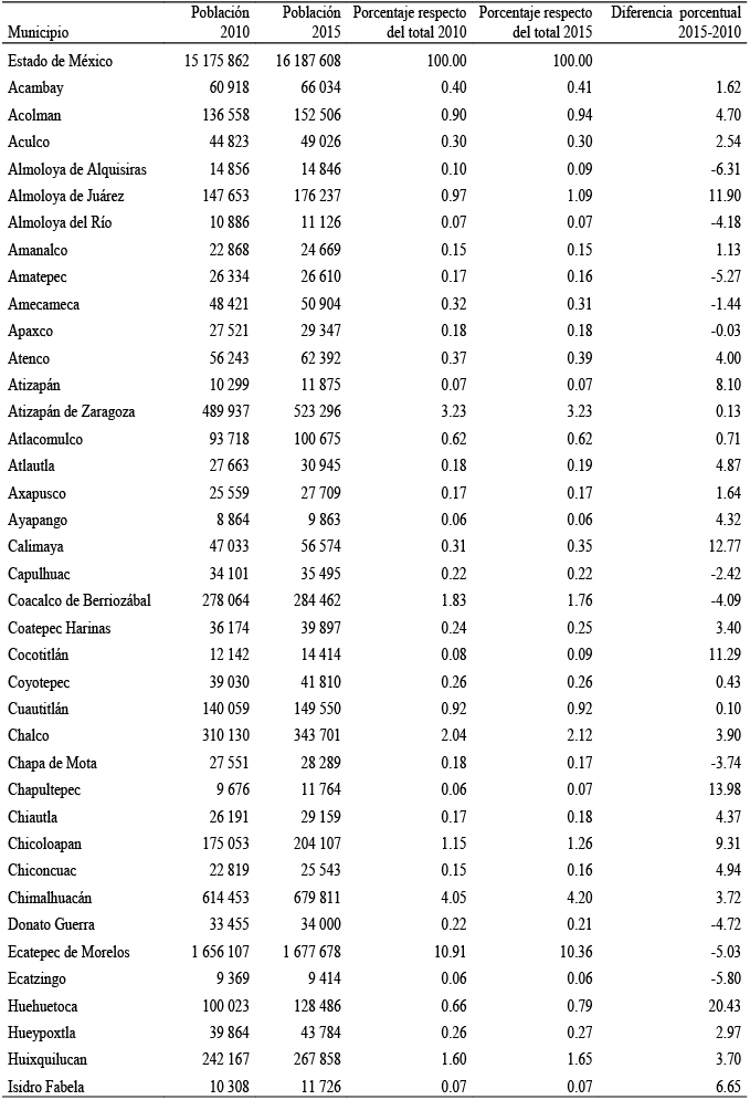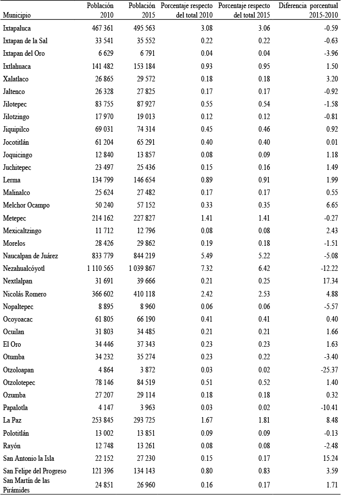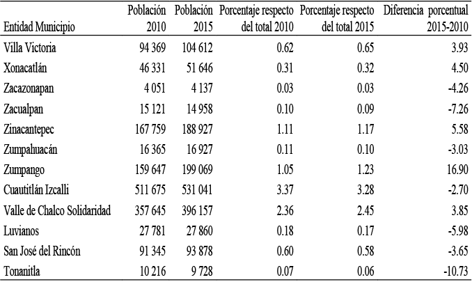 En la Tabla 3 se presentan las poblaciones de 2010 y 2015 con lo que se pueden estimar las porcentajes que representan del total (concentración poblacional), y por otro lado las diferencias porcentuales entre estos porcentajes. Lo que permite en primer momento identificar municipios con valores negativos en sus cambios poblacionales, en ocasiones con porcentajes de más de diez por ciento. Estas diferencias son sólo respecto del porcentaje que representa en la entidad. Es decir, el peso del municipio dentro de la entidad puede identificarse con la capacidad de cada municipio para consolidarse en espacio residencial.