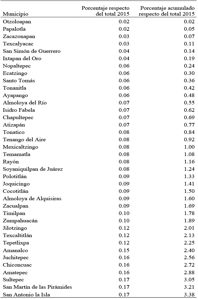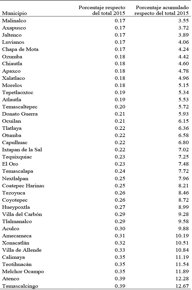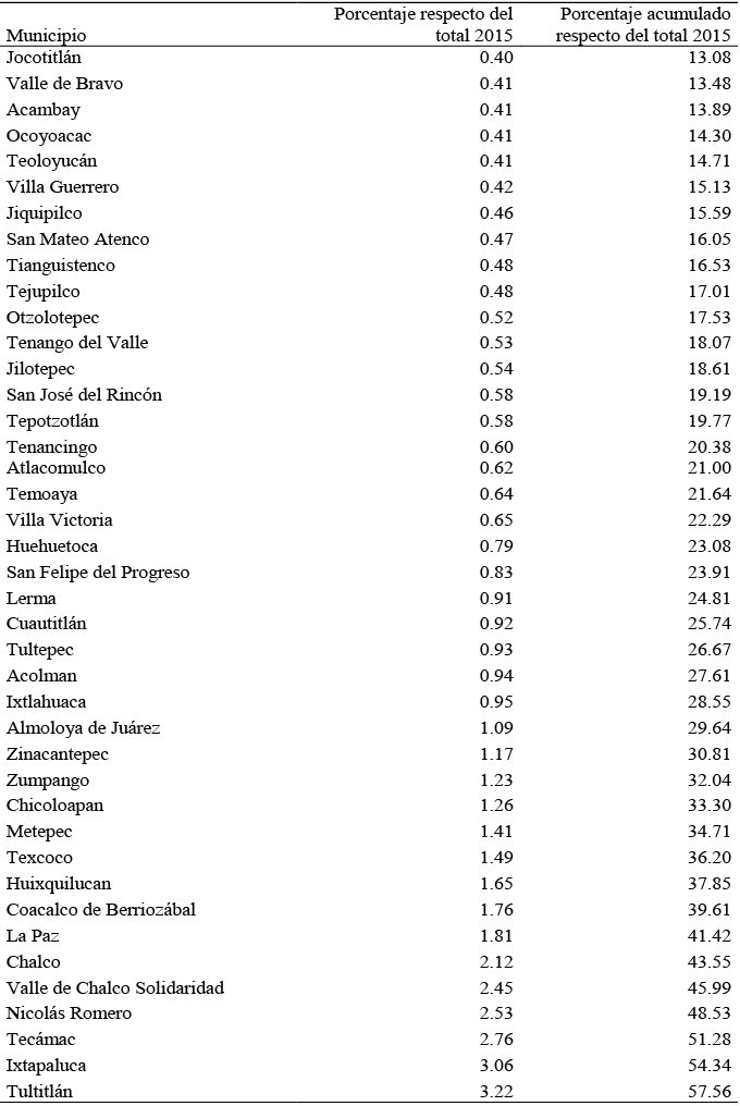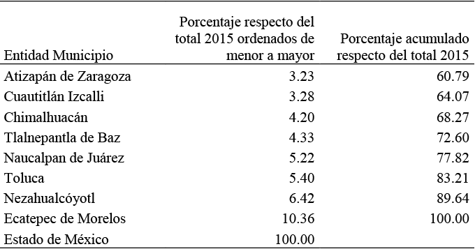 En la Tabla 4 a partir de los porcentajes acumulados se puede observar una gran concentración presente en algunos municipios, mientras que, por otro lado, en 69 municipios apenas alcanzan, de manera acumulada, poco más de diez por ciento de la población de la entidad.