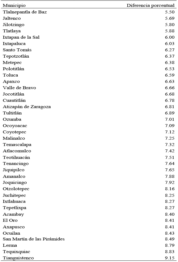 Algunos de los crecimientos más importantes, pero en municipios de tamaño pequeño son: San Antonio la Isla, Chapultepec, Calimaya y Almoloya de Juárez, en el sur de la Zona Metropolitana del Valle de Toluca (véase Figura 4 y Tabla 6).