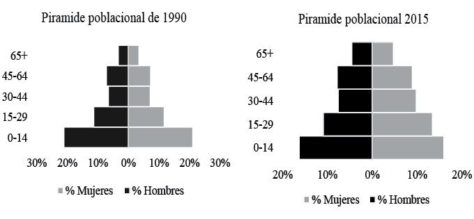 Es decir, disminuyó diez por ciento en 20 años, sin embargo predomina en el periodo. La población adulta está ubicada en el rango de edad de 15 a 64 años y está representada por 53 por ciento para el año de 1990, y por 63 por ciento para 2015.