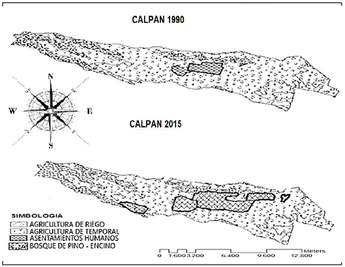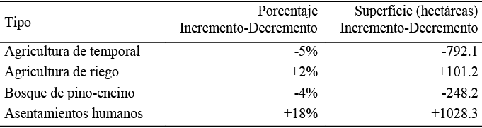 En la Figura 3 se observa que los asentamientos humanos han aumentado y se ha reducido el área de cultivo. Particularmente en la Tabla 9 se especifican las ganancias y pérdidas en el uso del suelo. Calpan, muestra una dispersión poblacional alejada de la cabecera municipal. Las causas de esa dispersión poblacional hacia nuevas localidades más alejadas de la cabecera municipal, se podrían explicar por diferentes factores que interactúan de forma conjunta, se fortalecen unos a otros y resultan difíciles de individualizar y acotar (Kontuly, 1998; Gkartzios y Scott, 2010; Cadieux, 2008). Torres (2014), precisa que en estos nuevos patrones de dispersión geográfica influyen causas macroeconómicas, tales como los ciclos de crecimiento económico o los efectos desencadenados por la globalización, también factores microeconómicos, demográficos, psicosociales relacionados con cambios en las preferencias residenciales, transformaciones técnicas vinculados a la mejora de las condiciones de trasporte y de la accesibilidad, entre otros.