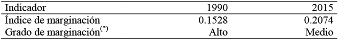 El Consejo Nacional de la Población (CONAPO, 2010), relaciona la marginación media y la pobreza con la migración internacional. En la Tabla 2 se observa que el municipio de estudio se encuentra en un grado medio de marginación para 2015, después de haber registrado un grado alto en 1990.