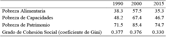 Ratificando la situación de pobreza en la que se encuentra el municipio de Calpan, en la Tabla 5 se puede observar la evolución de la pobreza Alimentaria5, de Capacidades6 y de Patrimonio7 en el periodo de 1990-2015, así como el grado de cohesión social8 medido a través del coeficiente de Gini, que indica que, para el municipio la cohesión social es baja, también con base en estos datos el CONEVAL (2015), indica que Calpan se encuentra en un polo de alta marginación.9 De 1990 a 2015, la pobreza alimentaria disminuyó en tres por ciento, la de Capacidades solo uno por ciento, sin embargo la pobreza de patrimonio aumentó cuatro por ciento.