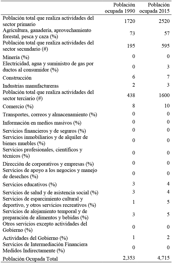 En la Tabla 6 se muestra que para 1990 la población ocupada fue de 2,353 personas, de las cuales el INEGI indica que 73 por ciento se ocupa en el sector primario, ocho por ciento en el secundario y 19 por ciento en el terciario de la economía. Para 2015, 57 por ciento se ocupa en el sector primario, 13 por ciento en el sector secundario y 30 por ciento en el sector terciario (INEGI, 1990 y 2015c).