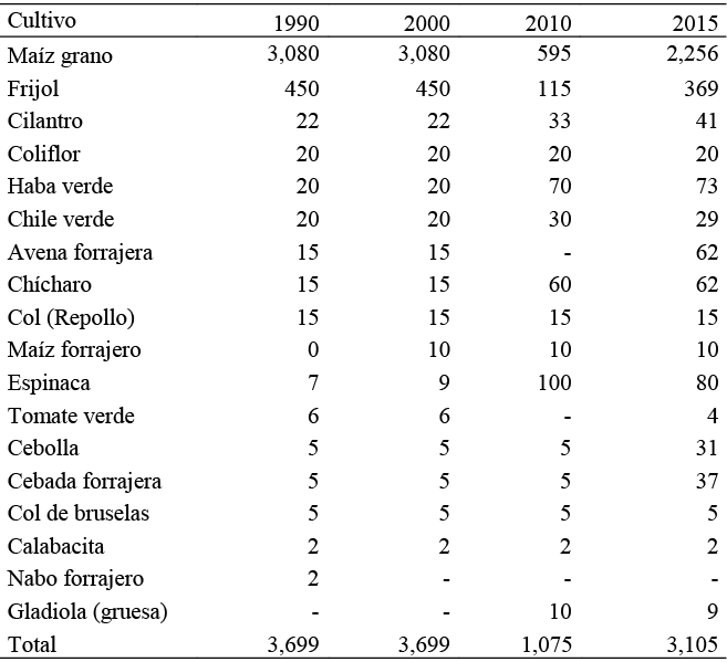 Una mayor articulación de la producción campesina en el mercado genera la disminución de la producción de granos básicos que se orientan al autoconsumo (Ramírez y Méndez, 2007). Los datos de la Tabla 7, indican que solo en 1990 se sembró nabo forrajero y a partir del 2010 en adelante se comienza a sembrar gladiola; los cultivos que se vuelven más representativos para 2015 son la espinaca, que mientras en el 1990 solo representaba 0.2 por ciento del total de la superficie sembrada, en 2015 representa tres por ciento, así también la cebolla que pasa de 0.1 a uno por ciento, la cebada forrajera de 0.1 a 1.2 por ciento, la avena 0.4 a dos por ciento y el chícharo que pasan de 0.4 a dos por ciento. Esta transformación de la estructura de cultivos no implica el cambio y sustitución completa de la vieja estructura orientada a la producción de maíz, más bien se van entretejiendo los cultivos.