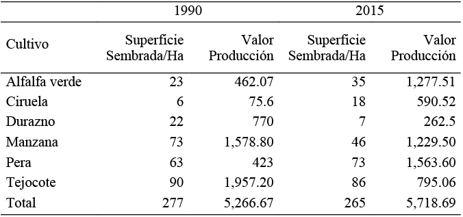 Las familias del municipio estudiado, realizan cambios en la producción de cultivos orientados por los precios de mercado, de manera que se puedan obtener los máximos beneficios de esta relación. Así, en la Tabla 8 se presentan los cultivos perennes en Calpan, y se considera que los cultivos menos rentables económicamente como el tejocote, la manzana o el durazno, han disminuido su producción; y se aumentó la producción de cultivos que las familias consideran más rentables, porque mencionaron que necesitan menores insumos para su producción y de los cuales obtienen mayores ventajas económicas.