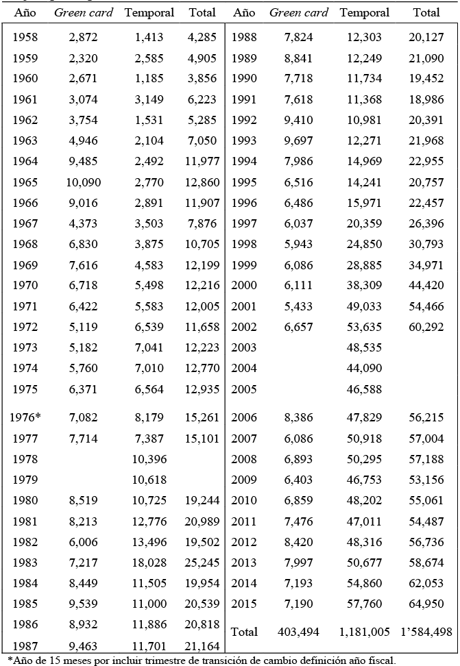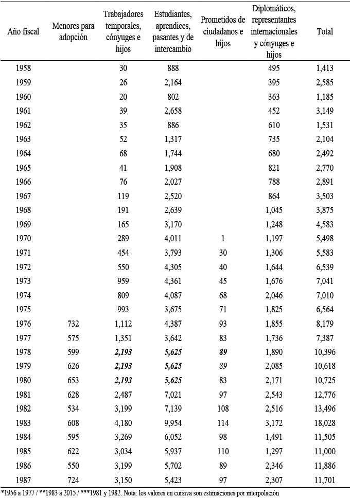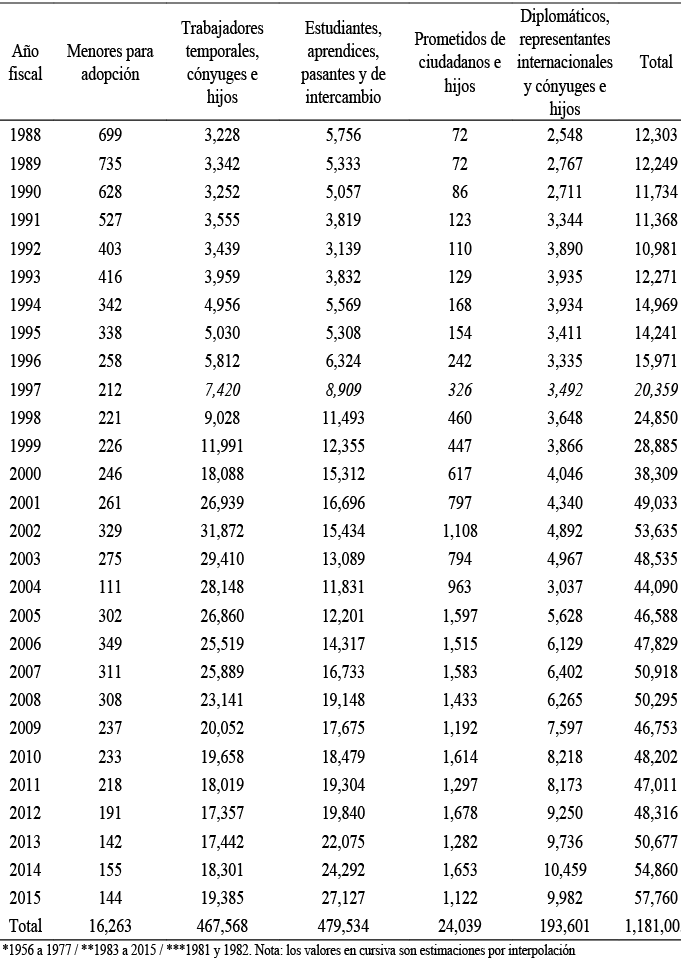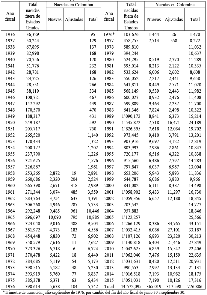 Dadas esas circunstancias, los datos sobre el total anual de “personas que obtienen la condición de residente permanente legal” han sido utilizados por largo tiempo para aproximarse al flujo de colombianos a Estados Unidos (Cardona et al., 1976; Cardona, Cruz y Castaño, 1980; Guarnizo y Espitia, 2007; Mejía, 2012).