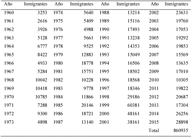 Como una forma de compensar lo anterior y en la búsqueda por tener una mejor idea de la periodización de la inmigración estudiada, más que de los valores absolutos, para construir series desde 1958, límite impuesto por la disponibilidad de los datos, he dado los siguientes pasos: