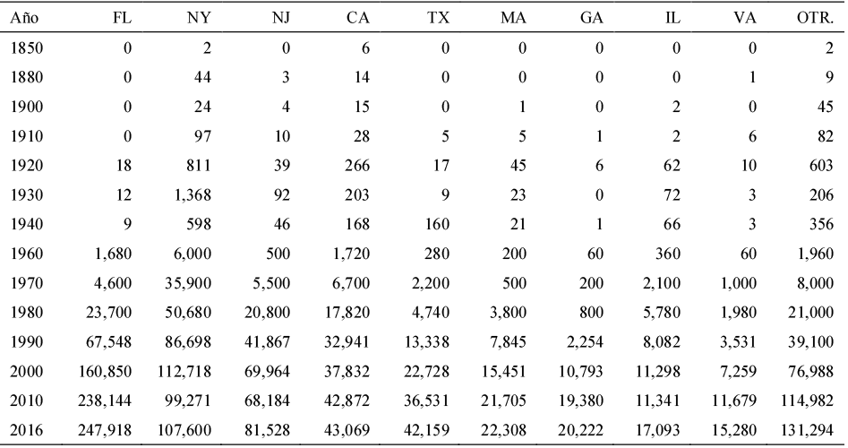 En el siglo previo a su despegue, la inmigración colombiana tuvo como áreas de llegada principales a los estados de Nueva York y California (ver Anexo 5), pero cuando en 1960 el primero había consolidado su posición, el segundo había reducido la suya.