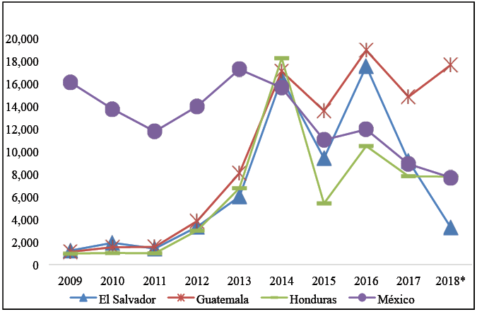 A partir de los datos oficiales que arroja la información de las autoridades estadounidenses podemos considerar claramente dos momentos: 2009-2014 y 2015-2018. El primero se distingue por un crecimiento explosivo en las aprehensiones en el territorio estadounidense de los menores migrantes de origen centroamericano hasta alcanzar su nivel más alto en 2014, mientras que México en 2009 aportaba la mayor cantidad de los cuatro países, en 2014, aunque su flujo se mantenía constante, su proporción quedaba por debajo de los tres países centroamericanos. El segundo momento es muy errático, pero su tendencia es descendente, con excepción de Guatemala, seguido por Honduras que son los dos países que aportan la mayor cantidad de menores migrantes aprehendidos; en cambio, México, termina en 2018 con una clara disminución de sus menores migrantes, respecto de 2009 y 2014 (Figura 1).
