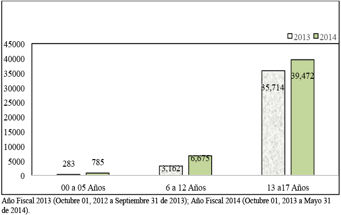 Otro de los aspectos que inciden en la vulnerabilidad y en el incremento de los riesgos a partir de 2012 en adelante, es la prevalencia de niñas, además de su corta edad, rasgos ambos que están actualmente en los registros estadounidenses entre los de mayor crecimiento. Y es que como se decía anteriormente, la vulnerabilidad creada por el propio Estado no tiene justificación alguna cuando los menores son indefensos por su corta edad, más si son niñas. Así, de octubre de 2013 a mayo de 2014 fueron registrados 785 menores de cinco años detenidos por el Immigration and Customs Enforcement1 Sólo bastará preguntarse a partir de las imágenes recientes de los medios de comunicación qué es lo que puede suceder cuando una o un menor de cinco años es separada(o) de sus padres en territorio estadounidense, ¿podrán comunicar cómo se llama?, o ¿de dónde proceden?, o ¿quiénes son sus padres? El mostrar estas cifras debiera de ser suficiente para una intervención directa desde México (Figura 2).
