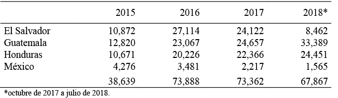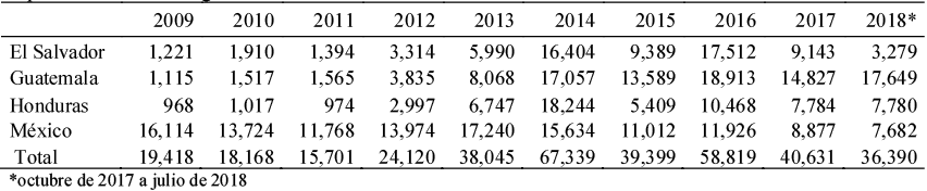 En diez años fiscales que abarca de octubre de 2009 a julio de 2018 se presentaron en Estados Unidos 203,079 eventos de intercepción y aprehensión de menores inmigrantes centroamericanos y 127,951 menores migrantes mexicanos; es decir, los menores centroamericanos representaban 61.3 por ciento y los mexicanos 38.7 por ciento, cuyo promedio anual fue 23,008 y 12,795 respectivamente; es decir, la mayoría de los menores migrantes son de los países de El Salvador, Guatemala y Honduras, no obstante, no por eso el problema para México es menor. El año fiscal en el que hubo mayores aprehensiones fue 2014, lo que coincide con la crisis por la saturación de los albergues existentes y por la improvisación de algunos de ellos en los campos militares (Tabla 1).