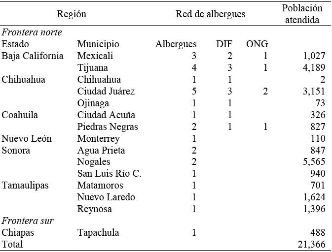 A diferencia de las Casas Ymca, los albergues creados por el DIF nacional y los DIF locales correspondientes a las ciudades fronterizas entraron en funcionamiento hasta 2001. Estos fueron creados como parte de la Estrategia Interinstitucional de Atención a Menores Fronterizos que se organizó desde 1996 y que con el tiempo dio origen al Programa Interinstitucional de Atención a Niñas, Niños y Adolescentes Fronterizos en el que participaron el Sistema Nacional para el Desarrollo Integral de la Familia, la Secretaría de Relaciones Exteriores y el Instituto Nacional de Migración (Ortega Soriano, 2009). Esta estrategia transformada en programa dio origen al sistema de albergues para menores “no acompañados” deportados de Estados Unidos.8 Nótese que su enunciación es imprecisa pues pareciera que no pretendía atender a los menores deportados, sino a “niños, niñas y adolescentes fronterizos”. No obstante lo anterior, sus funciones terminaron siendo una copia de las Casas Ymca: