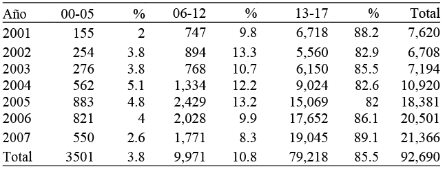 Ortega Soriano, Ricardo Alberto, 2009, Análisis de los anuarios estadísticos 2001-2007 de la red de albergues de tránsito de niñas, niños y adolescentes migrantes, DIF/UNICEF, México