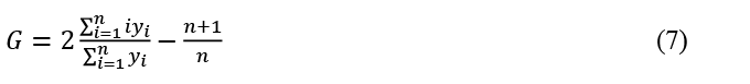 [7]Donde los ingresos de los n individuos de la población expresados como yi con i = 1 hasta n, deben estar ordenados de manera no decreciente (yi ≤ yi + 1).