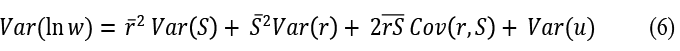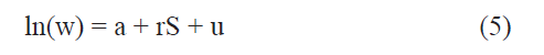 [5]Donde ln(w) es el logaritmo natural del salario, a es un término independiente, r la tasa de retorno, S los años de educación y u un término otros factores no relacionados con la educación que pueden influir el salario, este término tiene media cero. Si se toma la varianza de dicha expresión se obtiene: