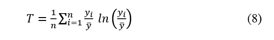 [8]Donde yi representa el ingreso del individuo i y donde representa el ingreso medio. Esta medida se encuentra entre 0, cuando todos los yi son idénticos, y ln(n), cuando una sola persona concentra todo el ingreso. Esta medida responde más sensiblemente a los cambios en la parte alta de la distribución. Esto se debe a que como se aprecia, cada ingreso está ponderado por el ingreso medio, y por lo tanto variaciones de las personas de ingresos altos tienen un efecto grande en el índice debido a su distancia del ingreso medio.