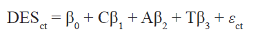 [3]Donde DES es una medida de desigualdad y C, A y T son matrices con unos y ceros que representan variables dummy para los cohortes, las edades y los distintos periodos de tiempo, respectivamente.3 Los datos por cohorte están ordenados en pares cohorte-año. Si existen m pares cohorte-año, cada matriz tendrá m filas, y el número de columnas serán el número de cohortes, el número de años, y el número de edades, respectivamente. Para evitar multicolinealidad perfecta con la constante se deben tomar todas las cohortes, años y edad menos una, en cada caso, para poder estimar dicho modelo, al estar trabajando con variables binarias. Sin embargo, aun así sería imposible de correr esa regresión. Esto se debe a que se presenta un problema al querer separar el efecto cohorte del efecto edad y el efecto periodo, dado por la dependencia lineal planteada en (1). En términos econométricos esto representa un problema de colinealidad perfecta entre las tres variables explicativas. También puede ser visto como un caso especial de un problema de identificación: a menos que se cuente con información adicional, es imposible separar un efecto del otro.