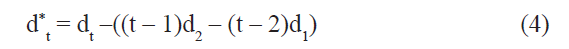 Con base en estas consideraciones, Deaton (1997) plantea correr la siguiente regresión dada por (2), donde las matrices C y A contienen variables binarias para todas las cohortes y las edades (menos una), y T tiene T-2 variables dummy, desde t = 3 a t =T, donde T es el último año de encuesta disponible, normalizadas de la siguiente manera: