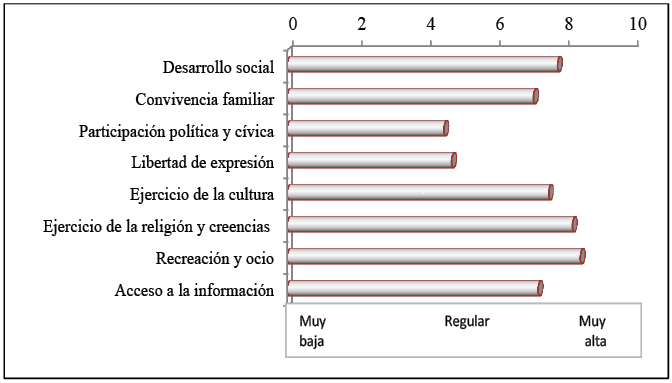 Por otro lado, contrariamente a los aceptables niveles en cuanto a la libertad para relacionarse socialmente, existe una poca participación en los actos políticos y cívicos, en este indicador del desarrollo social, la población estudiada en Madrid reportó en promedio un nivel de 4.5, lo cual corresponde a una participación “regular”. En cuanto a la libertad de expresión, los resultados muestran una situación “regular” con un promedio de 4.7 en la escala de cero a diez.