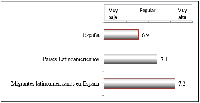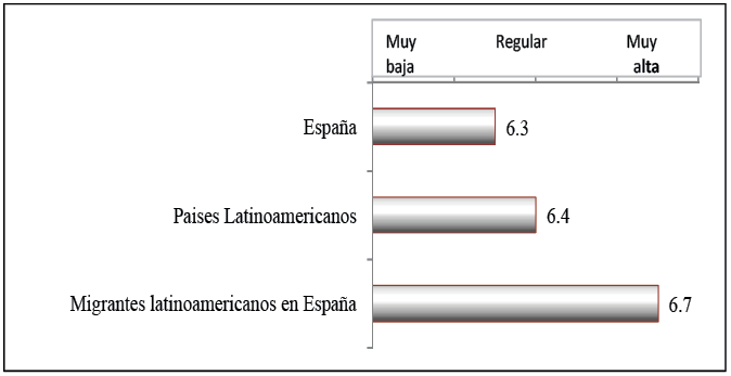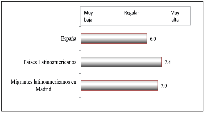 Como se puede observar, la población española nativa promedió 6.3 con los cual se ubica un nivel “regular”, mismo nivel en que se situaron el conjunto de países latinoamericanos promediando 6.4, en tanto que los migrantes latinoamericanos y caribeños que habitan en Madrid promediaron 6.7 en la escala cero a diez.