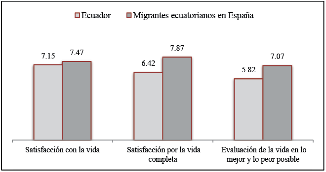Como ejemplo de lo anterior, en la Figura 13 se muestra una comparación entre los niveles de bienestar subjetivo de los migrantes procedentes del Ecuador, quienes son el grupo mayoritario de migrantes latinoamericanos en España y en el Distrito de Madrid; se observa que reportan niveles de satisfacción más altos que los de sus connacionales en su país.