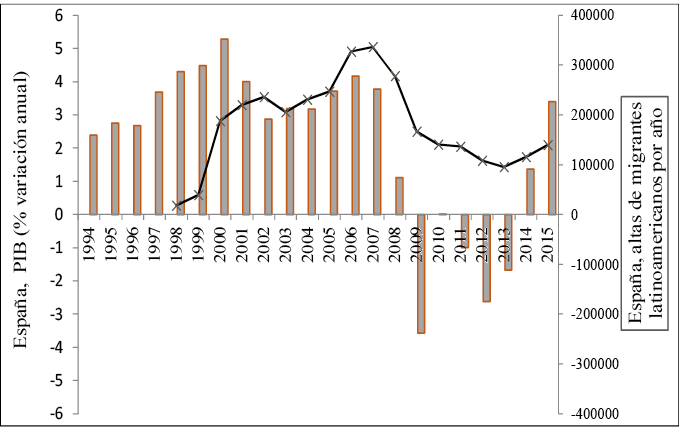 El crecimiento económico que España mantuvo durante la década de 1990 y que se prolongó hasta la crisis de 2008, demandó mano de obra extranjera y generó una gran migración, originada principalmente en los países sudamericanos; como se muestra en la Figura 1, específicamente a partir del año 1998, inicia un crecimiento paulatino de migrantes latinoamericanos hacia España, que alcanza su pico máximo en el año 2007 con 336,646 ingresos, y que a consecuencia de la crisis de 2008, inicia un descenso gradual hasta el año de 2013, en que solo se registraron 95,588 casos.