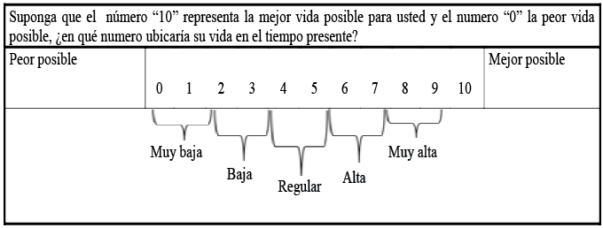 El siguiente análisis corresponde a la adaptación de la pregunta: “Suponga que el número “10” representa la mejor vida posible para usted y el numero “0” la peor vida posible, ¿en qué número ubicaría su vida en el tiempo presente?” La anterior pregunta consiste por si sola en un método para la medición del bienestar subjetivo y a pesar de que fue diseñada por Cantril en 1965, en la actualidad continúa siendo una de las herramientas más utilizadas, principalmente por investigadores y organismos que generan estadísticas mundiales sobre el bienestar objetivo, como Gallup (2009), Veenhoven (2015) y United Nations International Children’s Emergency Fund (2007).