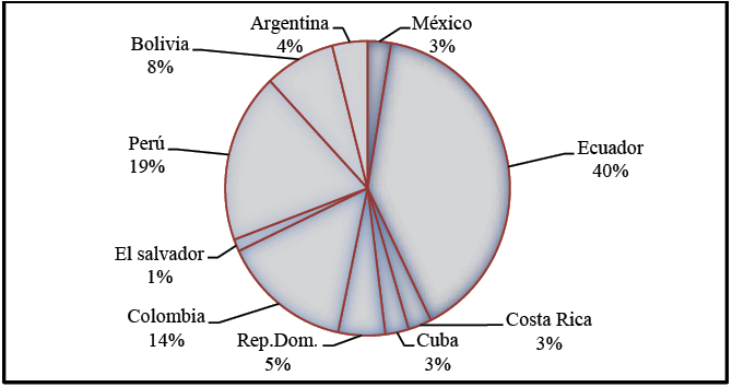 Las naciones con menor representación son El Salvador con uno por ciento del total, México, Cuba y Costa Rica con tres por ciento en cada caso, Argentina y República Dominicana con cuatro y cinco por ciento, respectivamente. Por región, Norteamérica representada sólo por México apenas constituye tres por ciento, mientras que la región de Centroamérica y el Caribe conforman 12 por ciento y los procedentes de Sudamérica representaron 85 por ciento del total (Figura 3).
