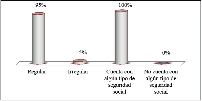 En cuanto a la situación laboral y al sector del empleo, 64 por ciento de los migrantes captados se emplean en el sector terciario o de servicios, mientras que 16 por ciento lo hacían en el sector secundario. Ninguno de ellos reportó emplearse en algún trabajo propio del sector primario. El resto del porcentaje se distribuye entre 2.7 por ciento que dijeron dedicarse al cuidado del hogar y un considerable 17.3 por ciento que dijo estar desempleado; destaca que, en este grupo poblacional, ningún encuestado manifestó estar jubilado.