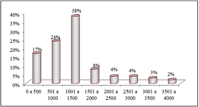 Congruente con lo anterior, en la Figura 7 se muestra el ingreso de la población migrante captada, se observa una hegemonía en el rango de 1,001 a 1,500 euros, 38 por ciento de la población encuestada recibe en promedio mensual esta cantidad, destaca por un lado que 41 por ciento de los trabajadores migrantes, no logran superar la ganancia de mil euros por mes y, por otro lado, que apenas 13 por ciento de la población migrantes encuestados logró superar la ganancia de dos mil euros por mes.