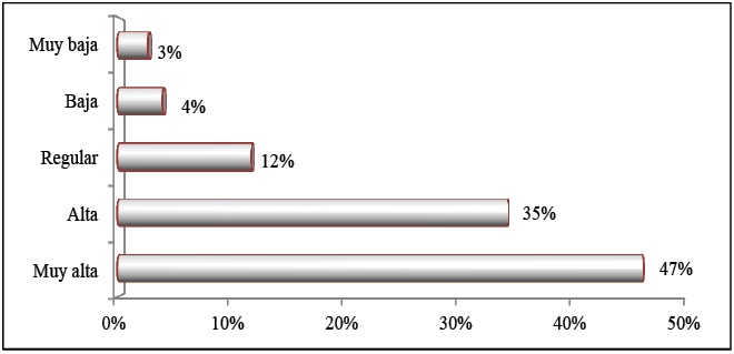 Los resultados obtenidos en el estudio muestran que, en cuanto a la percepción de la libertad para relacionarse socialmente, en promedio los latinoamericanos en Madrid reportaron 7.8 en la escala cero a diez, lo cual corresponde a un nivel “alto”; sin embargo, en un análisis más detallado se observa que 47 por ciento de la muestra, percibe como “muy alta” su libertad para relacionarse socialmente (Figura 8).