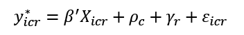 Los modelos se formulan como respuesta latente, donde es una variable latente que corresponde a la persona “i” con estudios en el campo de especialidad “c” y residencia en la región “r”. Esta variable representa la diferencia en la percepción de satisfacción que proporcionan las opciones referidas a trabajar (yicr = 1) o no hacerlo (yicr = 0). Se considera que cuando la diferencia es positiva, la persona elige trabajar (yicr = 1); lo contrario si la diferencia no es mayor a cero. Se supone que la variable latente es función lineal de un vector de variables individuales, Xicr, con coeficientes fijos, β (primer nivel); de un intercepto aleatorio que varía entre especialidades, ρc (segundo nivel) y de otro que varía entre regiones, γr, (tercer nivel), ambos con distribución normal y media cero, además de una perturbación aleatoria, εicr, tal que E(εicr│Xicr, ρc, γr) = 0. Así, para el caso de mujeres con algún año de estudios de carrera profesional, la variable latente se expresa como: