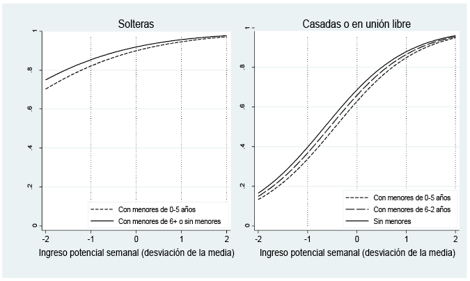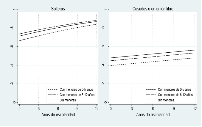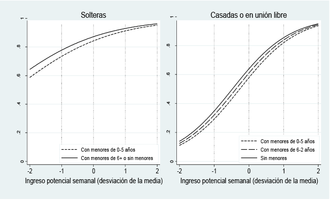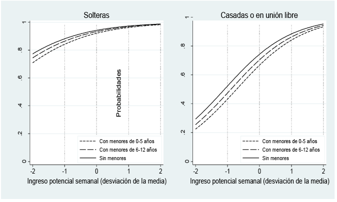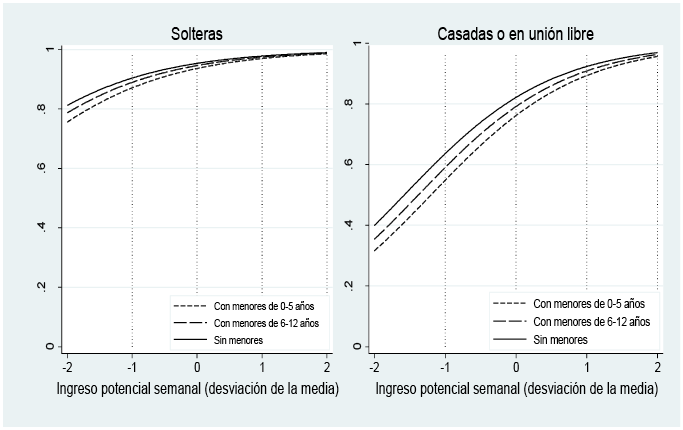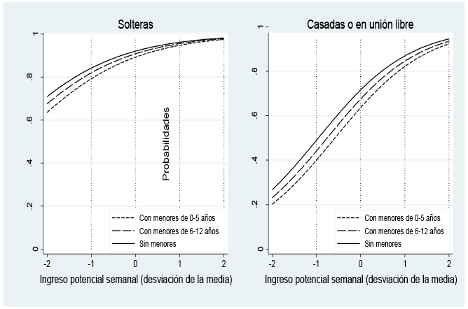 En esa aseveración se logró identificar algunos matices: para los niveles de estudio técnicos y profesionales, las probabilidades de participación laboral entre casadas y solteras tienden a converger cuando los ingresos laborales potenciales son lo suficientemente elevados; en estos casos pareciera que vivir en pareja establece el arreglo de que si las remuneraciones no son suficientemente elevadas, la decisión es que la mujer no participe en el mercado laboral; lo cual significa que el salario de reserva de las casadas en general es mucho más elevado que el de las solteras; resultado que no está reñido con la noción del efecto sustitución del modelo de asignación del tiempo de Becker (1965).
