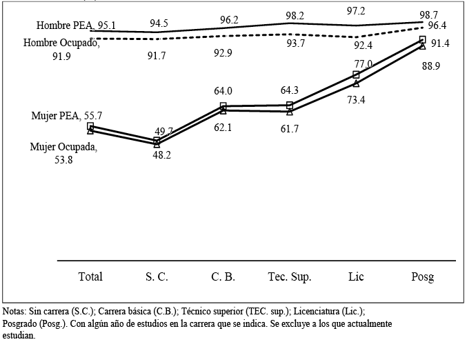 Focalizando al caso de mujeres con estudios profesionales, acorde con el modelo neoclásico y la teoría de la segmentación, la formación educativa debe ser determinante en la participación laboral. Bajo el modelo neoclásico significa que la dedicación al hogar tiene un alto costo de oportunidad, por lo que la mujer con estudios profesionales buscaría tener mayor participación laboral. Con la teoría de la segmentación laboral, dada la calificación de la mujer con estudios especializados, no aplicaría que sea considerada como fuerza de trabajo secundaria, por lo que los empleos potenciales en principio serían más atractivos. Por su parte, la perspectiva de los roles de género no establece si el nivel educativo podría anular o atenuar el resultado dominante del hombre en la distribución del tiempo de sus integrantes entre el trabajo remunerado y las actividades del hogar.
