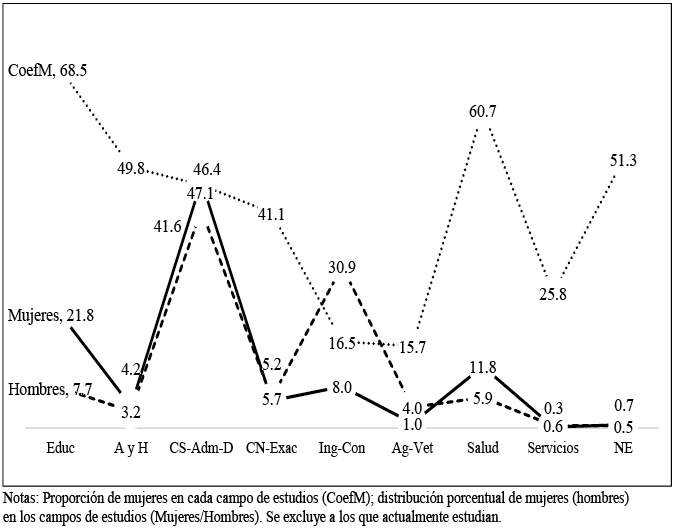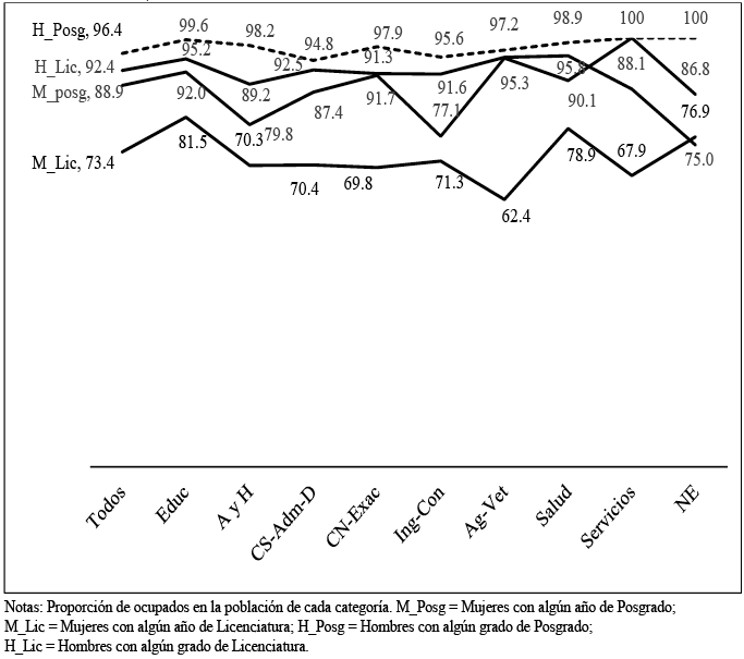 De los ocho campos de estudios, solamente en dos son mayoría las mujeres: en educación y docencia 68.5 por ciento de los ocupados son mujeres; en salud la proporción de mujeres es cercana a 61 por ciento (Figura 3). En otros campos la mayoría son hombres, aunque también hay presencia importante de mujeres en artes y humanidades (49.8 por ciento); sociales, económico, administrativas y derecho (46.4 por ciento) y naturales y exactas (41.1 por ciento). Donde hay menos proporción de mujeres es en agro-veterinaria (15.7 por ciento) y en ingenierías y construcción (16.5 por ciento). Es importante tener en cuenta la distribución por género dentro de cada campo de formación ya que algunas podrían ser vistas como de mayor aceptación social y cultural hacia la mujer, por ejemplo, educación, pero en otras podría ser lo contrario, por ejemplo, agricultura, ingenierías y construcción.