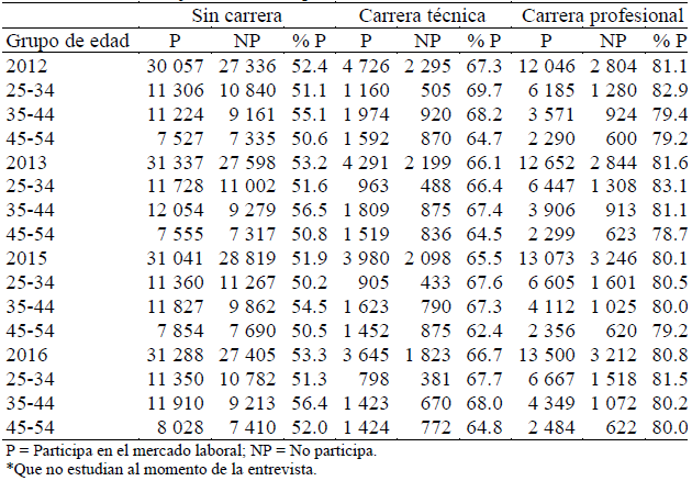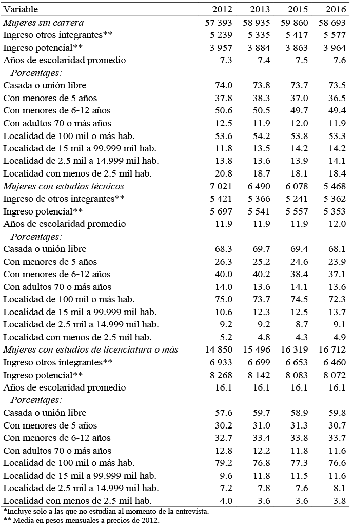 En esta investigación se plantea que esa posición tiene mayor peso en hogares donde la mujer tiene poca formación educativa. En el caso de mujeres con estudios profesionales se propone que su incorporación laboral depende en menor medida de los roles de género y está más orientada a la construcción de sus carreras laborales y en ese sentido, la dedicación al hogar en sustitución de trabajo remunerado les representa altos costos de oportunidad frente a opciones de empleo con buenas perspectivas de ingreso y satisfacción laboral. Además, la posibilidad de un mejor ingreso familiar permitiría obtener asistencia externa para el cuidado de los hijos y del hogar,2 así como el acceso a un estilo de vida catalogado como de clase media o de clase alta, resultados que ejercen un efecto demostración que estimula al resto de mujeres a trabajar.