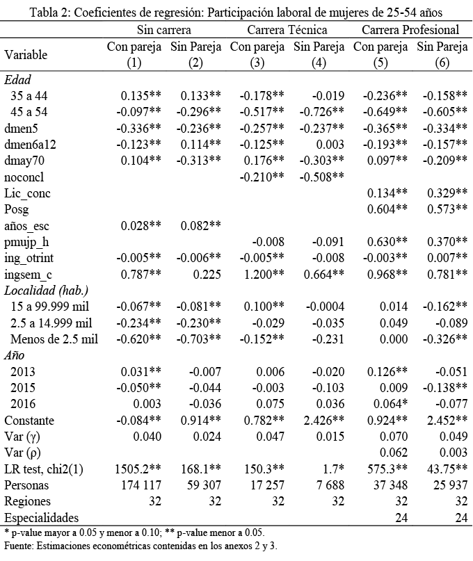 Los resultados correspondientes a los coeficientes de regresión se resumen en la Tabla 2, mayores detalles de las estimaciones pueden ser revisados en los anexos 2 y 3. Para cada nivel de estudios se estimaron dos ecuaciones, una para mujeres casadas (o en unión libre) y otra para mujeres sin pareja (solteras, viudas, divorciadas o separadas). El modelo que controla la heterogeneidad regional (ecuación 3) se utilizó tanto para las mujeres sin carrera (columnas 1 y 2) como para las que tenían algún año de estudios técnicos (columnas 3 y 4). Para las mujeres con algún año de estudios de carrera profesional se utilizó el modelo que controla los efectos aleatorios provenientes de las diferencias regionales y de las especialidades (ecuación 4, columnas 5 y 6).