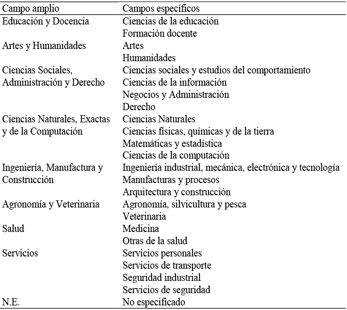 Para visualizar un mejor perfil de las profesiones con énfasis de género a continuación se tomaron en cuenta las personas mayores de 24 años con algún grado de estudios en los niveles de licenciatura y posgrado y que actualmente no estudian. Además, se consideraron siete campos de formación (Anexo 1): Educación y Docencia (Educ); Artes y Humanidades (A y H); Ciencias Sociales, Económico Administrativas y Derecho (CS-Adm-D); Ingenierías mecánica-eléctrica, industriales y de la construcción (Ing-Con); Agrícola, Agropecuario y Veterinaria (Ag-Vet); Medicina y otras del área de la salud (Salud) y, Área de Servicios (Servicios).