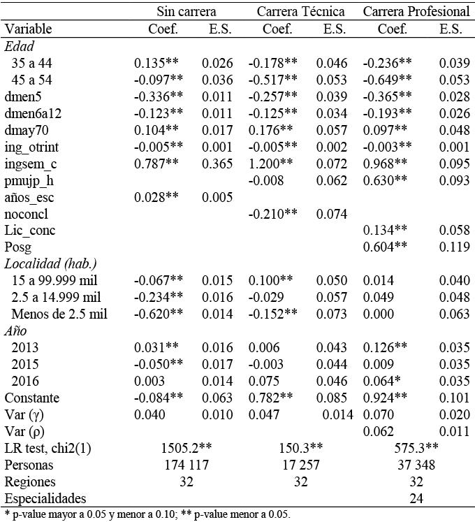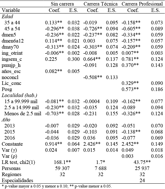 Con el propósito de considerar el efecto de la heterogeneidad, para cada grupo de mujeres con algún año de estudios profesionales, se estiman modelos Logit de efectos mixtos en tres niveles: el primer nivel lo conforman las personas; el segundo nivel está representado por 24 especialidades (Tabla A1 del anexo) y, el tercer nivel lo constituyen las 32 entidades federativas. En las mujeres con estudios técnicos y sin carrera se estima un modelo de dos niveles, donde el primer nivel es el individual y el segundo las 32 entidades.