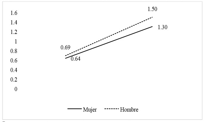 Un tercer factor analizado es el sexo de los estudiantes. Los alumnos hombres en el área de Comunicación y de Matemáticas tienden a presentar una mayor ganancia educativa que las mujeres, siendo significante estadísticamente esta diferencia (Figura 7 y Figura 8; Tabla 7). Esta situación hace que se cierre la brecha por sexo en el área de Comunicación, aunque sigue siendo mayor el nivel de logro de las mujeres.